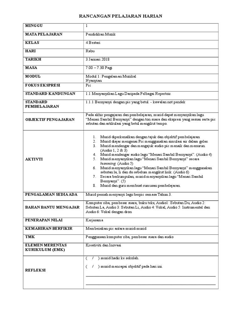 Bagi Penggal 3 ini dilaksanakan bermula 2 Januari 2022 hingga 28 Februari 2022. Minggu 41 Mata Pelajaran Dunia Muzik Kelas Tahun 4 Cemerlang Hari Isnin Tarikh. Rancangan Pengajaran Harian Pendidikan Muzik Tahun 4.